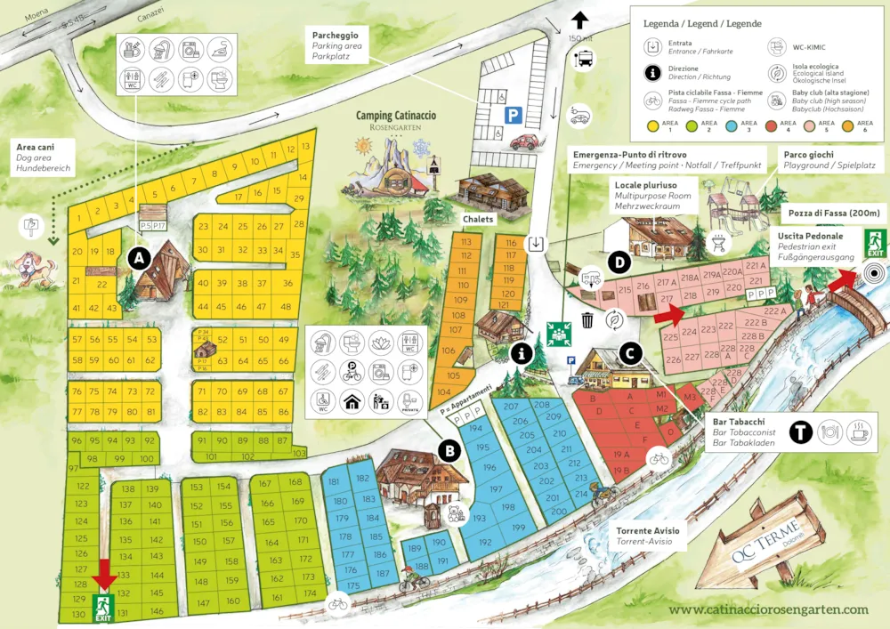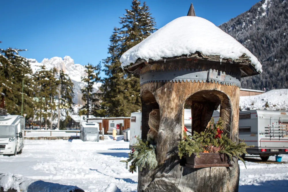 Inclusi nel prezzo: Wi-Fi ad alta velocità, acqua calda libera ai servizi, tassa ecologica, sconti ristoranti/pizzerie, tessera Val di Fassa Card + Trentino Guest Card, sconti noleggio bici. In inverno non è previsto spazio per apertura tendalini/verande. Elettricità a contatore opzionale 16 Amp.