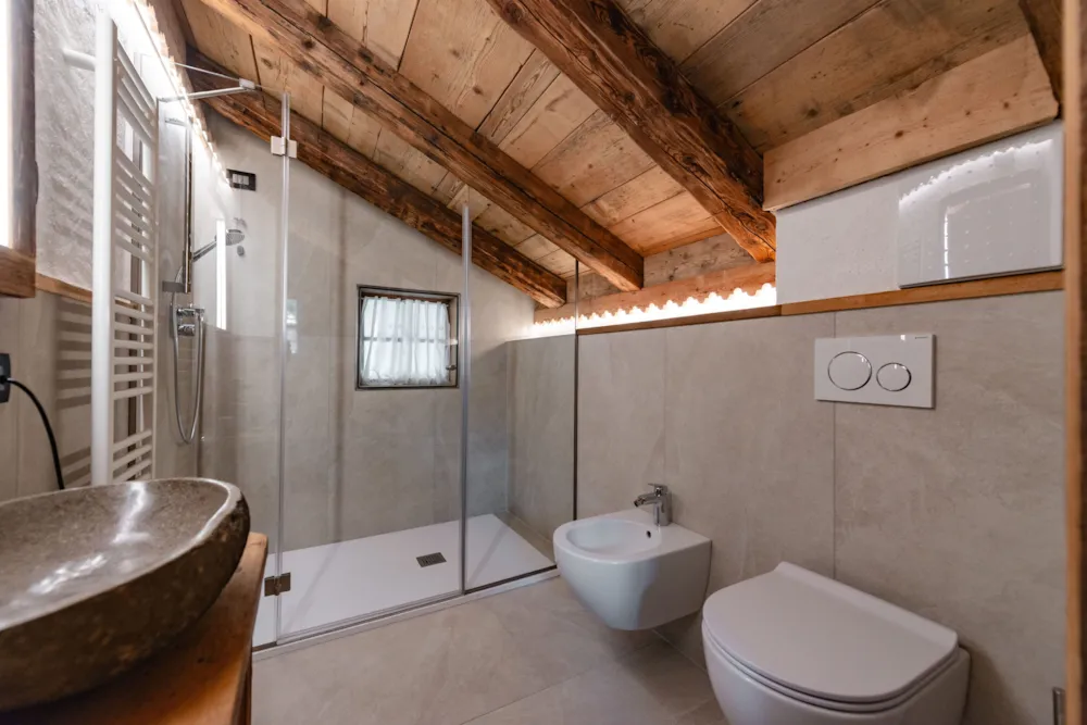 Lo chalet è meraviglioso. Grande, realizzato con cura ed eleganza. Si respira all’interno la sensazione della baita di montagna moderna, calda, avvolgente. Spazi ampi lo rendono molto vivibile, il balcone e il giardino privato permettono agli ospiti di viverlo a pieno, sia dentro che fuori.Ottimi i bagni con ampie docce. Letti comodissimi. Smart tv molto grande. Cucina ben fornita. Assolutamente una sistemazione di livello.